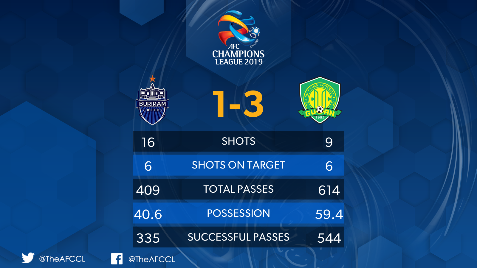 โอกาศยิง4ครั้งแรกได้"3ประตู" และเป็น3ประตู Hattrick จาก Cédric Bakambu กองหน้าอิมพอร์ทโดยตรงจากสเปนอดีตศูณย์หน้าเรือดำน้ำสีเหลือง"บียาร์เรอัล" กองกลางเราสู้แถบไม่ได้ต้องมาเจอ Renato augusto กลองกลางทีมชาติบราซิล และ Jonathan Viera อิมพอร์ทโดยตรงจากสเปนเช่นกันจากทีม"ลาส พัลมาส"เหตุที่สู้ไม่ได้คือ"แม่มเก่งเกิน" เรียกได้ว่าเล่นแต่ละลูกจ่ายแต่ละลูก"เหนือชั้น" มาตรฐานต่างชาติของBuriramและBeijing ห่างชั้นกันอย่างมากและไม่ใช้ตัวที่หมดของแต่อย่างใดมาด้วยกำลังเม็ดเงินล้วนๆ Buriramได้1ประตูจาก ศุภณัฐ เหมือนตา ทำลายสถิตินักเตะที่อายุน้อยที่สุดที่ทำประตูในACLได้ .