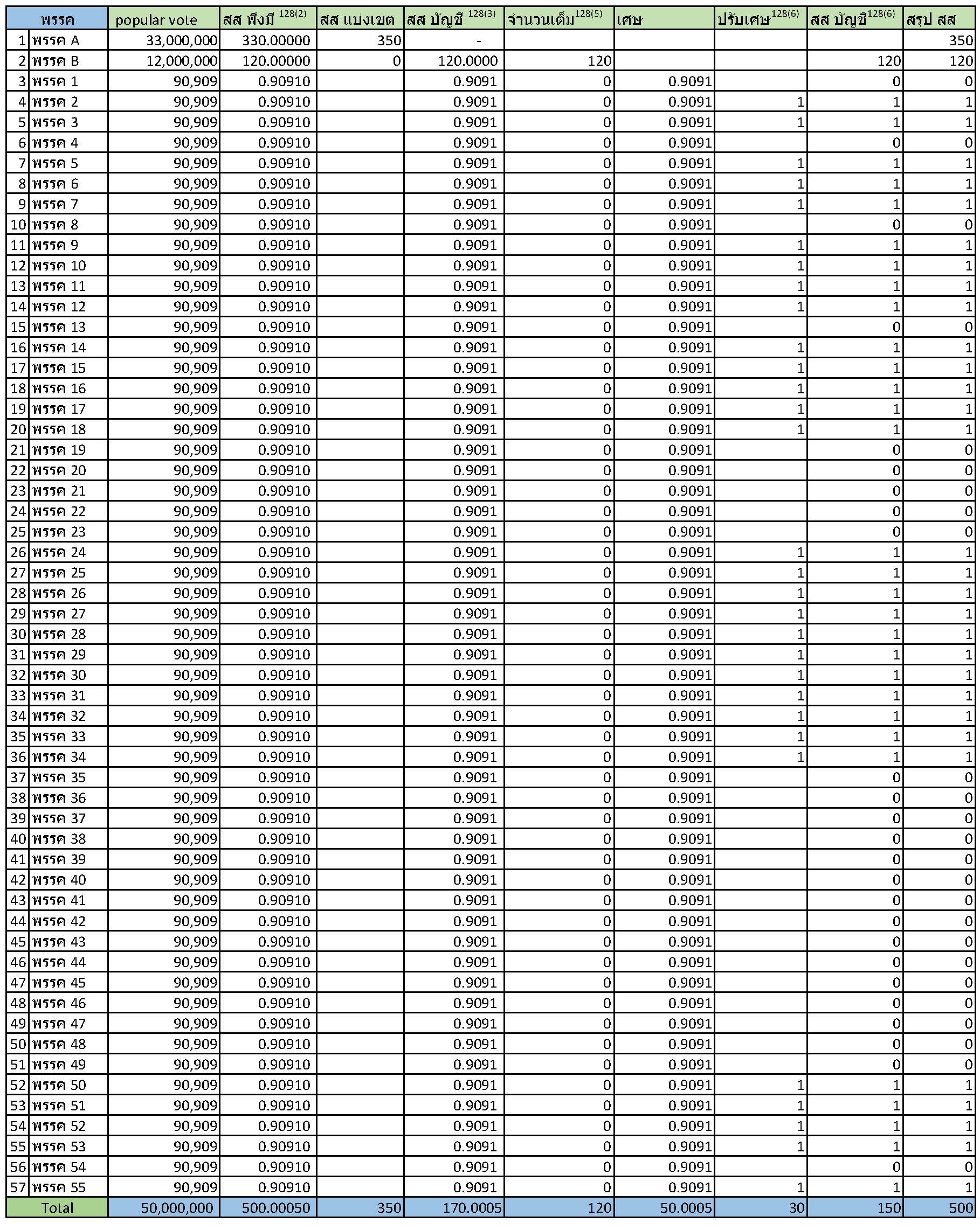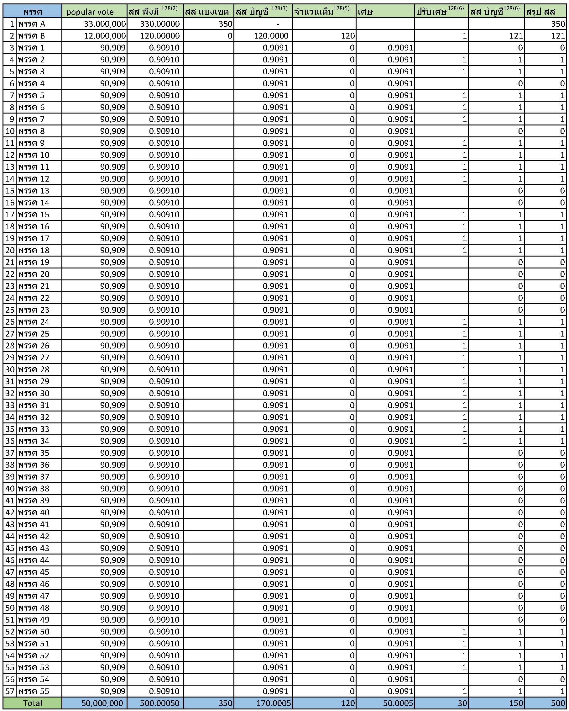 ผมขอจำลองตัวเลข แบบนี้ และ ผมคำนวณตามวิธีของ กกต ได้คำตอบตาม ตารางนี้