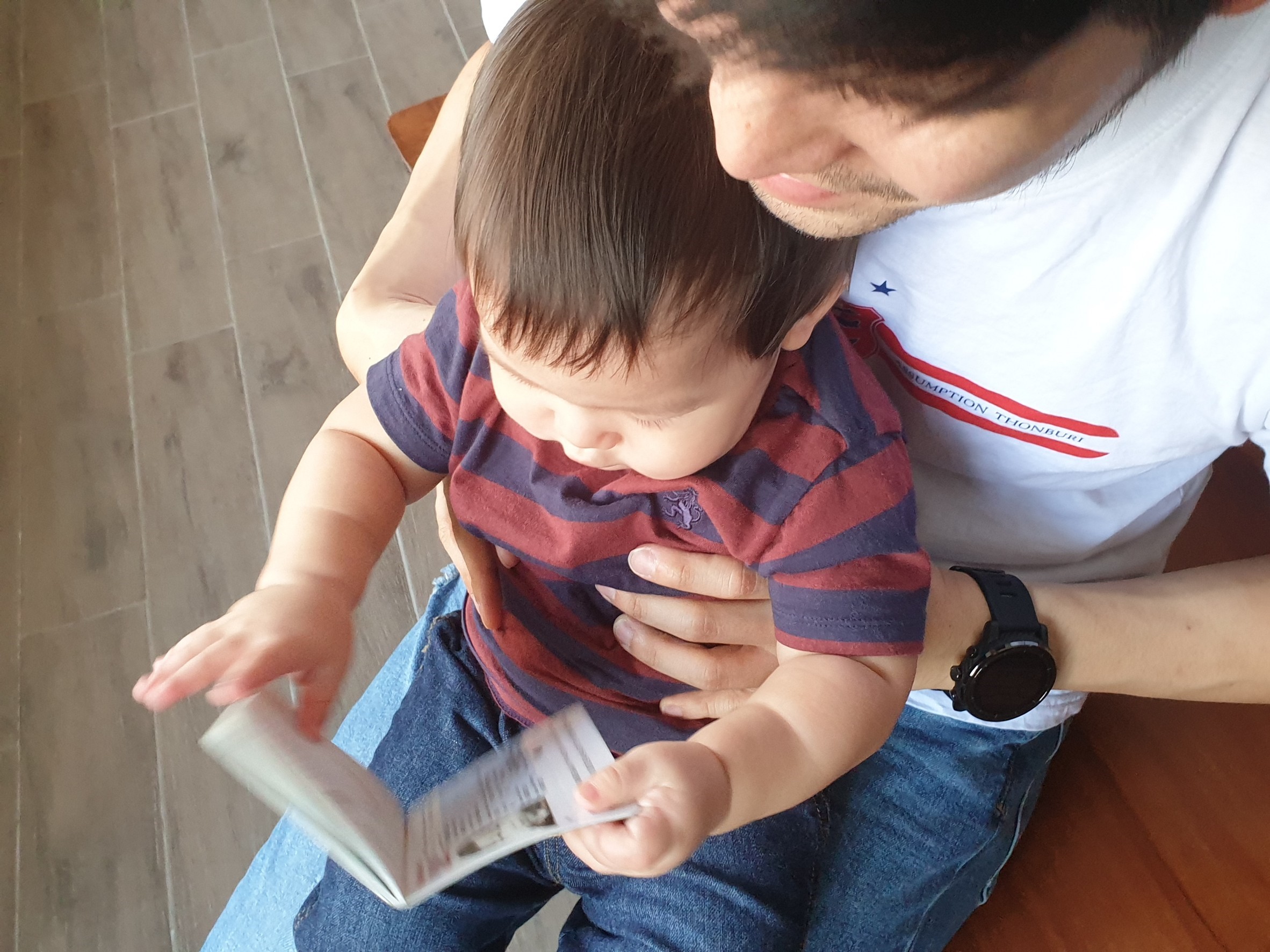 พอจะถ่ายรูปก็ต้องเล่นหลอกล่อลูกซักหน่อย หน้าจะได้หล่อๆ สวยๆ กันนะคะ เสร็จแล้วก็ทำการพิมพ์ลายนิ้วมือค่ะ (เตรียมทิชชู่เปียกไว้สำหรับเช็กหมึกด้วยนะคะ)