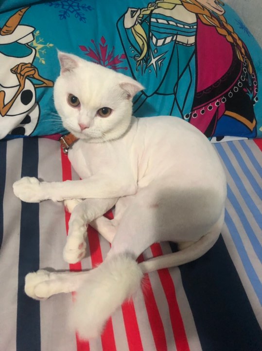 ลักษณะ : สีขาวพึ่งตัดขน มีรอยเชื้อรา 2-3 จุด หูตกเล็กน้อย