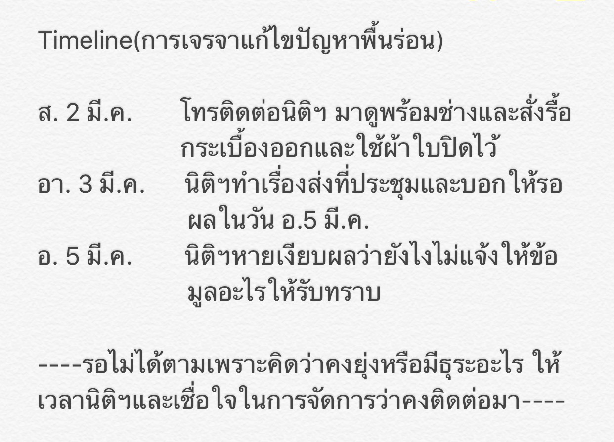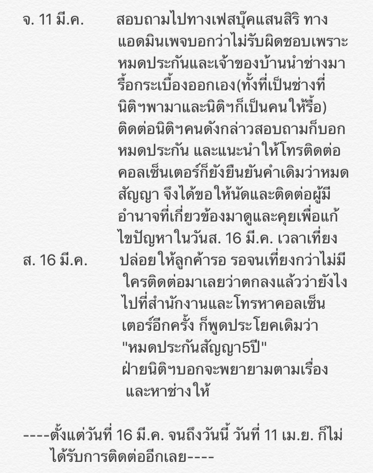 รบกวนขอความช่วยเหลือสอบถาม คุณพ่อจขกท.ซื้อบ้านเดี่ยวแบรนด์ส.ถนนติวานนท์สัญญารับประกัน5ปี เพิ่งหมดสัญญา8เดือนแต่เจอปัญหาพื้นชั้นข้างล่างร่อน คุยกับนิติฯเขาก็ให้ช่างมาแกะรื้อกระเบื้องส่วนที่ร่อนออกและนำผ้าใบมาปิดไว้ ตรงนี้เราก็ชื่นชมว่าบอกปัญหาปุ๊บนิติก็มาแก้ไขทันที ก็ชื้นใจนึกว่าวางใจได้แล้ว แต่หลังจากนั้นกลับบอกปัดความรับผิดชอบทุกอย่างพูดแต่ว่า