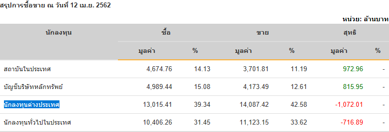 Sinthorn Summary 12/4/2562 : ต่างชาติขายสุทธิ -1,072.01 ลบ.