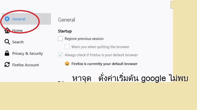 เข้า firefox เข้า option เข้า general หาที ตั่งค่าเริ่มต้น เป็น google เเบบ ภาพ 2 ไม่พบ