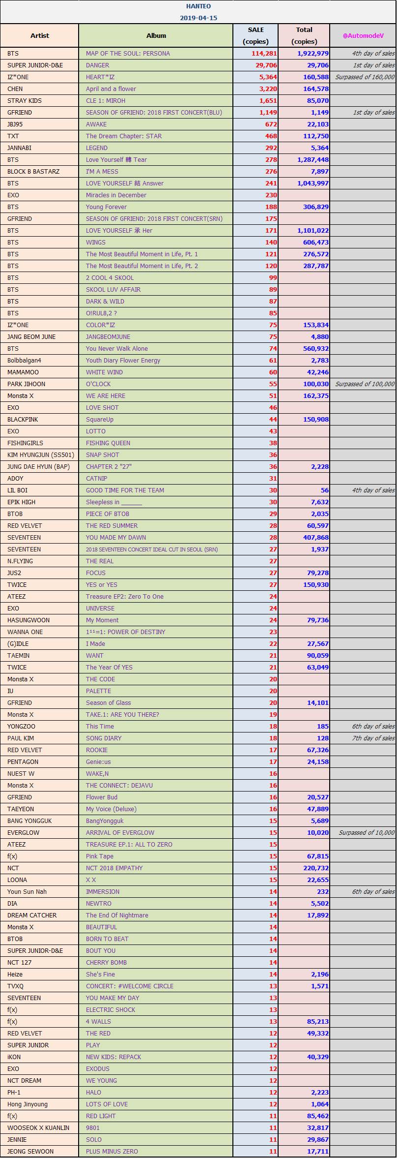 ยอดซื้ออัลบั้มจากชาร์ต HANTEO 15 เมษายน 2562 + ยอดขายรวมรายสัปดาห์