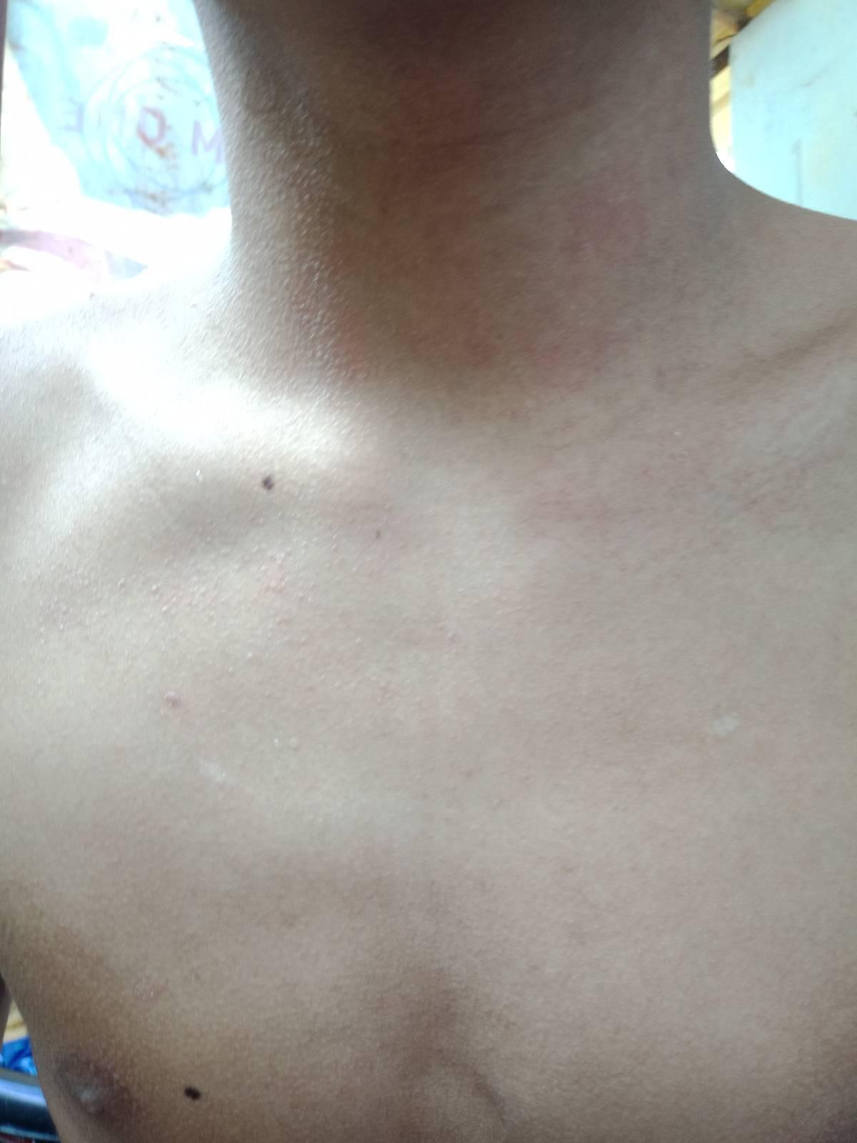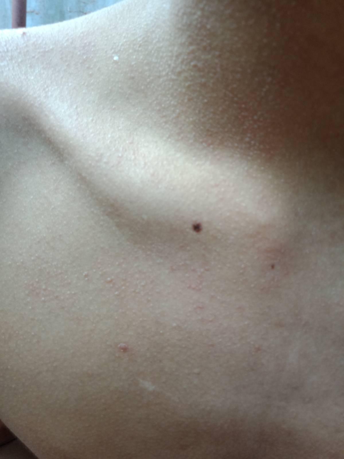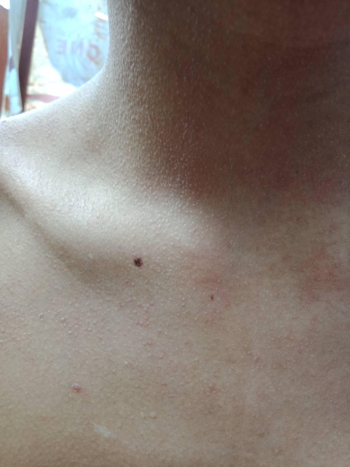 สังเกตุว่าเวลาร้อนมากๆ หรือเหงื่อออกจะขึ้นเป็นจุดแดงๆตามรูปหนะค่ะ ตอนแรกเข้าใจว่าเป็นผื่นร้อน แต่พอหาข้อมูลดู ที่เราเป็นมันไม่ได้เป็นตุ่มใสๆ แล้วบางทีก็ไม่คัน บริเวณที่เป็น ก็ตั้งแต่คอไปจนถึงสะดือเลย