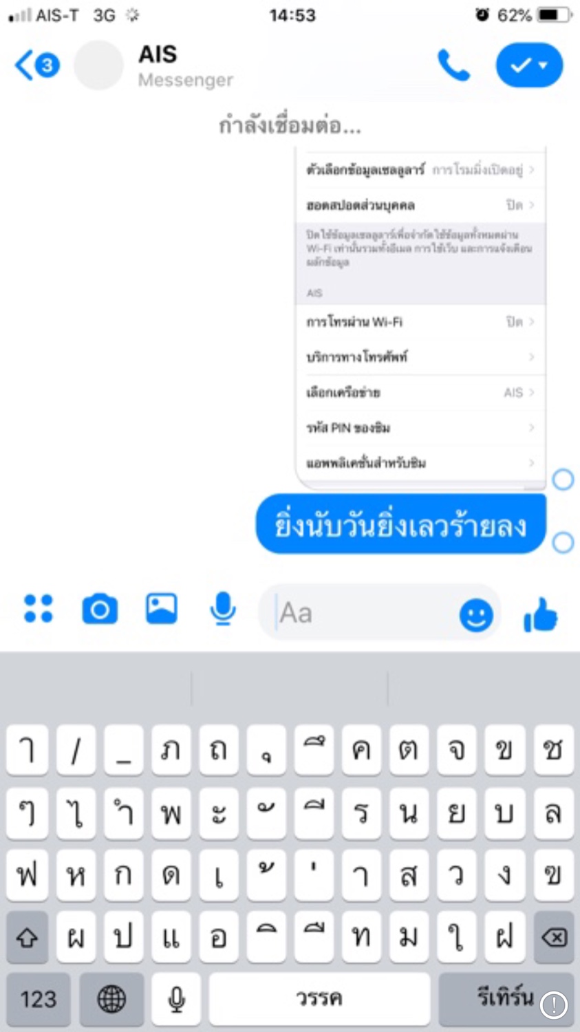 คือผมย้ายมาจาก ค่าย น้องฟ้าจะครบปีละ ซึ่ง ที่ย้ายมาก็ไม่ได้มีปัญหาอะไร คืออยากลอง คิดว่าทางนี้น่าจะเร็วแรงทะลุนรก พร้อมกับเสนอโปรราคา888แต่ลดให้จ่ายเพียง444บาท แต่เอาจริงๆ ผมต้องเติมโปรเสริมตบอดเพราะเน็ตไม่ค่อยจะพอ คราวนี้ 4-5เดือนให้หลังจากเปลี่ยนมาคือ แม่เจ้า เน็ตเน่าเละตุ้มเปะ เบาๆหน่อยก็เน็ตโครตเต่าทำไรไม่ได้ หนักข้อหน่อย ก็ ไม่มีบริการ งง เลยผม จากที่คนที่บ้านบอกอยากลองมาใช้ AIS เห็นเค้าโฆษณาว่ามีโปรนั้นโปรนี้ ผมได้แต่บอกเบาๆว่า อย่าเลย ไม่อยากหัวเสีย อย่ามาเลย อยู่แบบเดิมอะดีแลัว ถึงช้าบ้างไรบ้างแต่คงไม่ถึง ไม่มีบริการ ขึ้นวันละ 7-8รอบ