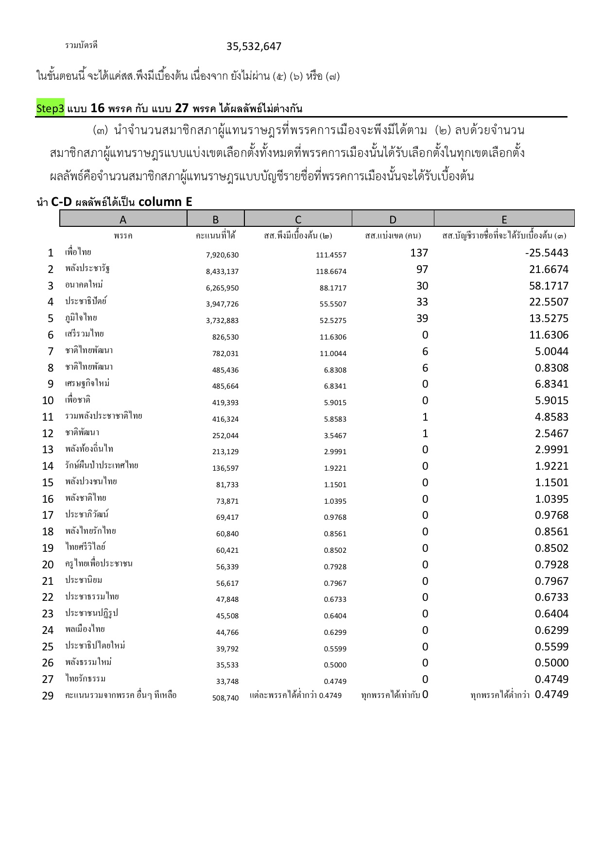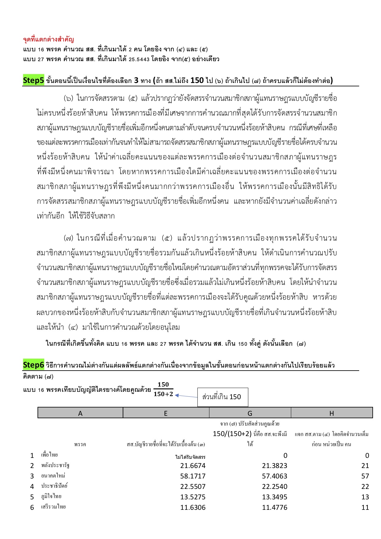 2 ถ้าวิธีคำนวณไม่ผิด ถามต่อคนที่เห็นด้วยกับแบบที่คำนวณได้ 27 พรรค เหตุใดวิธีการคำนวณแบบ 27 พรรคจึงมองข้ามขั้นตอน (๔) ละครับ ในความคิดเห็นผมไม่ควรจะข้ามเพราะข้อ (๔) ไม่ใช่เงื่อนไขที่ต้องเลือก แตกต่างจากข้อ (๖) และ (๗) ที่ต้องเลือกอย่างใดอย่างหนึ่ง หรือมีแนวคิด หรือสูตรใดที่แตกต่างรบกวนช่วยอธิบายด้วยครับ