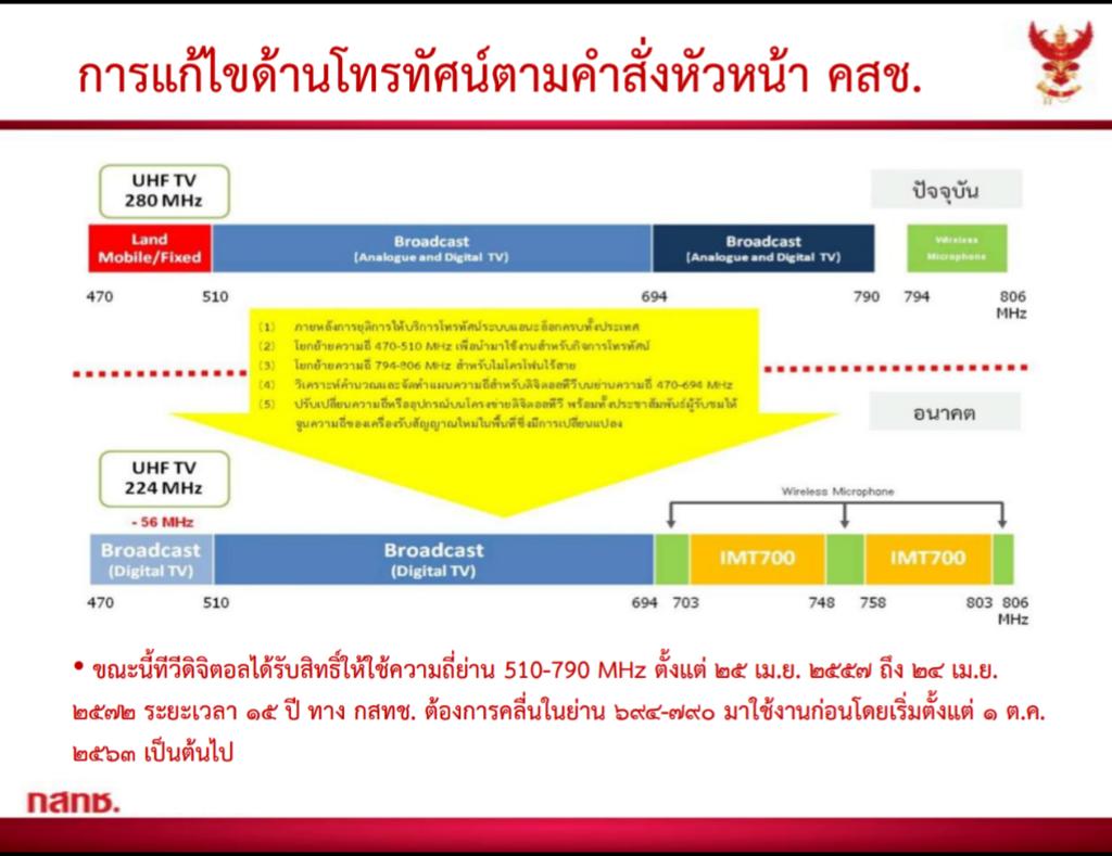 กสทช.แจงผู้ประกอบการค่ายมือถือ-ทีวีดิจิทัล ส่งหนังสือรับสิทธิ์ ม. 44 ภายใน 10 พ.ค.นี้ จากนั้นจะคลอดเงื่อนไขภายในสิ้นเดือน พ.ค. หากไม่พอใจสามารถยกเลิกการขอรับสิทธิ์ได้ ยันค่ายมือถือต้องประมูลคลื่น 700 MHz ด้วยถึงจะได้รับการขยายค่าคลื่น 900 MHz กสทช.พร้อมจัดสรรคลื่นให้คนละ 15 MHz ราคา 25,000-27,000 ล้านบาท จากนั้นจ่ายค่าใบอนุญาตเดือน ต.ค. 2563 เพื่อนำเงินมาเยียวยาให้ทีวีดิจิทัล