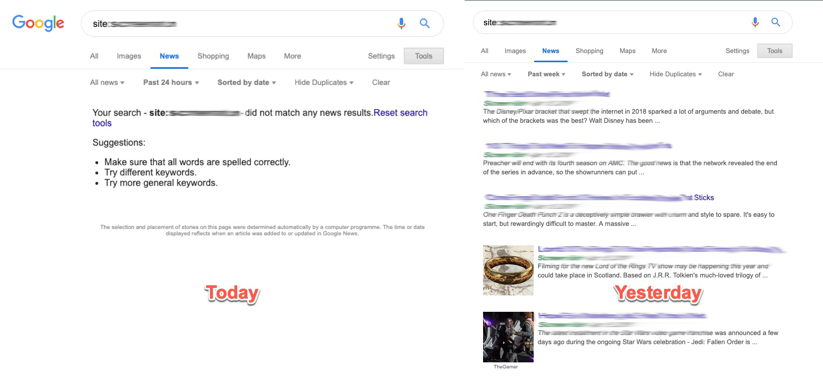 ภาพหน้าจอบางส่วนจากผลกระทบของข้อบกพร่องนี้ที่ปรากฏในผลการค้นหาของ Google News
