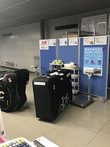 แต่แล้วก็ต้องสะไพร้ เอ้ย เซอร์ไพร้ส์! กระเป๋าจักรยานลงมาแล้ววางอย่างเรียบร้อยตรงช่อง Belt flight ที่เราโดยสารมารอบนี้กระเป๋าเดินทางตามออกมาแบบไม่ต้องเดินหาให้ตื่นเต้นเหมือนไฟลท์รอบที่แล้วๆๆ สเตปถัดไปออกไปแล้วต้องหาที่ส่งกระเป๋าจักรยานตามแผนเดินออกมาช่องผู้โดยสารขาออกมองซ้ายขวา หาป้าย Information น่ะสิ! หันขวาเดินสุดทางตามป้ายก็เจอแล้ว Baggage Delivery Service วิธีการส่งก็ไม่ยาก เอาที่อยู่โรงแรมให้จนท.ไป แจ้งชื่อ เบอร์โทร แล้วก็วันที่เราอยากให้กระเป๋าถึงปลายทางเท่านั้นเอง ค่าเสียหายสำหรับจักรยาน 2 คัน ¥7,200 ถือว่าไม่น่าตกใจเมื่อคูณกลับเป็นเงินไทยแล้ว