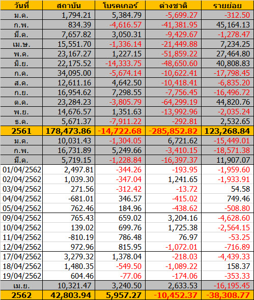 Sinthorn Summary 19/4/2562 : ต่างชาติขายสุทธิ -174.06 ลบ.