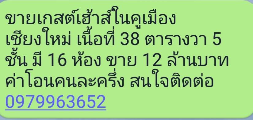 ขายเกสต์เฮ้าส์ในคูเมืองเชียงใหม่ เนื้อที่ 38 ตารางวา อาคารสูง 5 ชั้น มี 16 ห้องพัก ขายราคา 12 ล้านบาท ค่าโอนคนละครึ่ง สถานที่ใกล้เคียง ถนนคนเดิน ประตูท่าแพ ตลาดสมเพชร วัดพระสิงห์ สนใจติดต่อมือถือและไลน์ 0979963652
