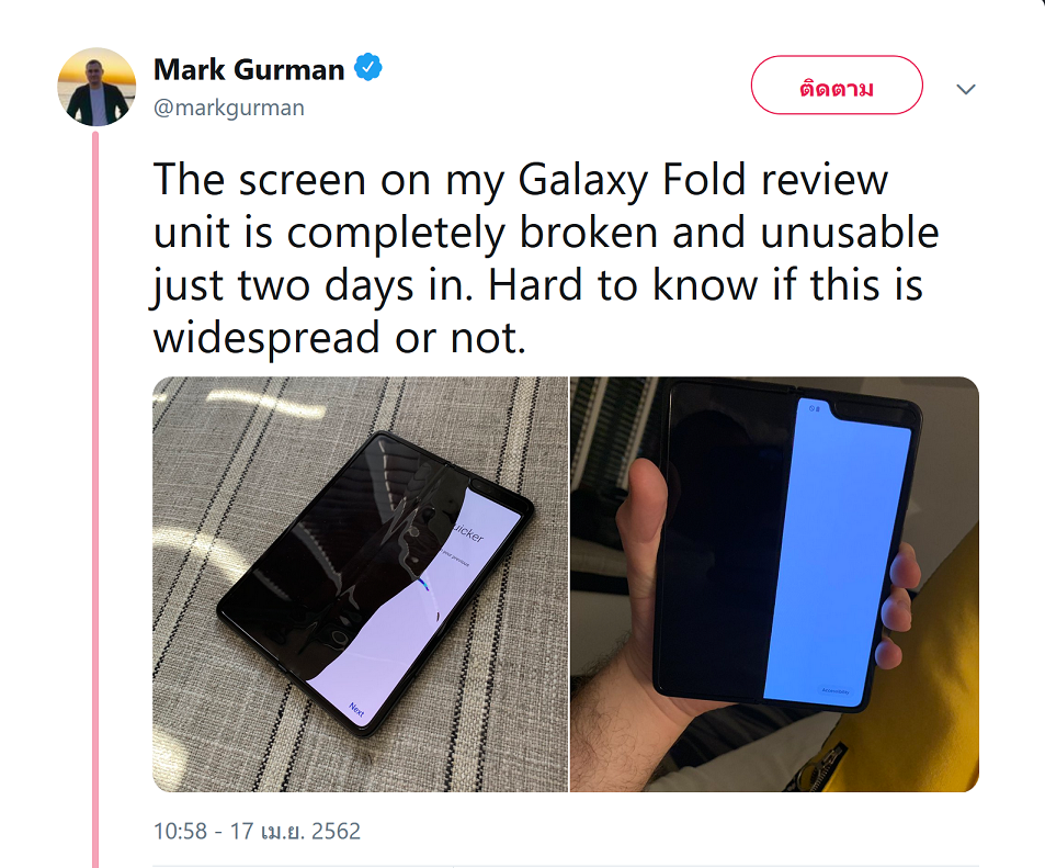 มาร์ค เกอร์แมน ผู้สื่อข่าวของสำนักข่าวบลูมเบิร์ก โพสต์ผ่านทางทวิตเตอร์ส่วนตัวว่า หน้าจอโทรศัพท์มือถือยี่ห้อซัมซุงรุ่นนี้ ที่เขาได้รับมาทดลองใช้งานนั้นพังและใช้งานไม่ได้ตั้งแต่สองวันแรก และบอกได้ยากว่าปัญหานี้เกิดขึ้นเป็นวงกว้างหรือไม่