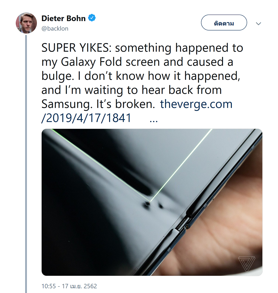 ดีเทอร์ บอห์น จากสำนักข่าว Verge ก็เผยแพร่ปัญหาในทำนองนี้ผ่านทางทวิตเตอร์ส่วนตัวเช่นกัน " น่ากลัวมาก! มีบางอย่างเกิดขึ้นกับหน้าจอ Galaxy Fold ของผมจนเป็นรอยนูนขึ้นมา ผมไม่รู้ว่ามันเกิดขึ้นได้ยังไง และผมก็รอคอยคำตอบจากซัมซุงด้วยครับ มันพังแล้ว"