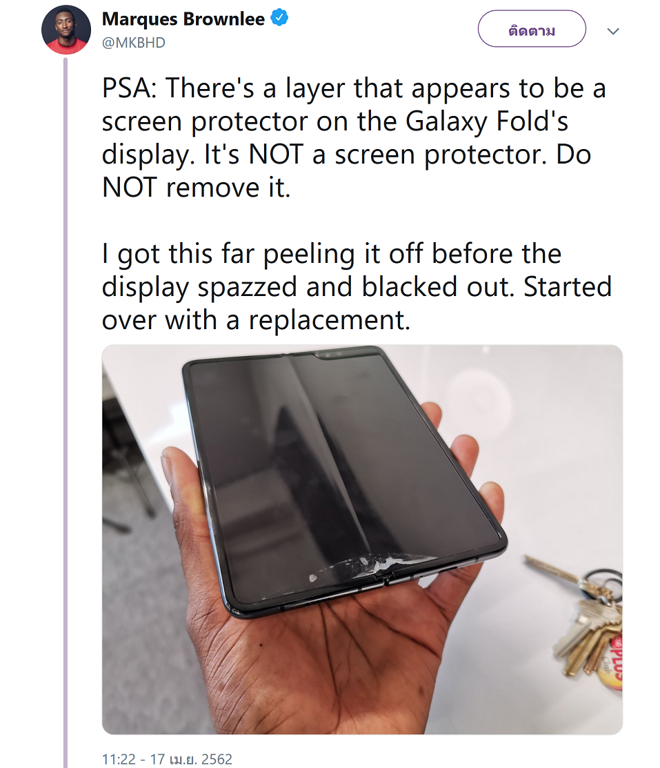 เกอร์แมน จากสำนักข่าวบลูมเบิร์ก ดึงฟิล์มออก รวมถึงยูทิวบ์เบอร์ชื่อดัง มาร์เกส บราวน์ลี ที่กล่าวผ่านทวิตเตอร์ส่วนตัวว่า "ข่าวประชาสัมพันธ์ครับ มีแผ่นที่ดูเหมือนจะเป็นฟิล์มกันรอยอยู่บนหน้าจอของ Galaxy Fold ด้วย แต่มันไม่ใช่ฟิล์มกันรอยนะครับ อย่าไปดึงมันออก" มาร์เกสเตือน "ผมลอกมันออกไปเท่านี้แล้วจอก็รวนก่อนจะดับไปเลย แล้วค่อยหาเครื่องใหม่มาเปลี่ยน"