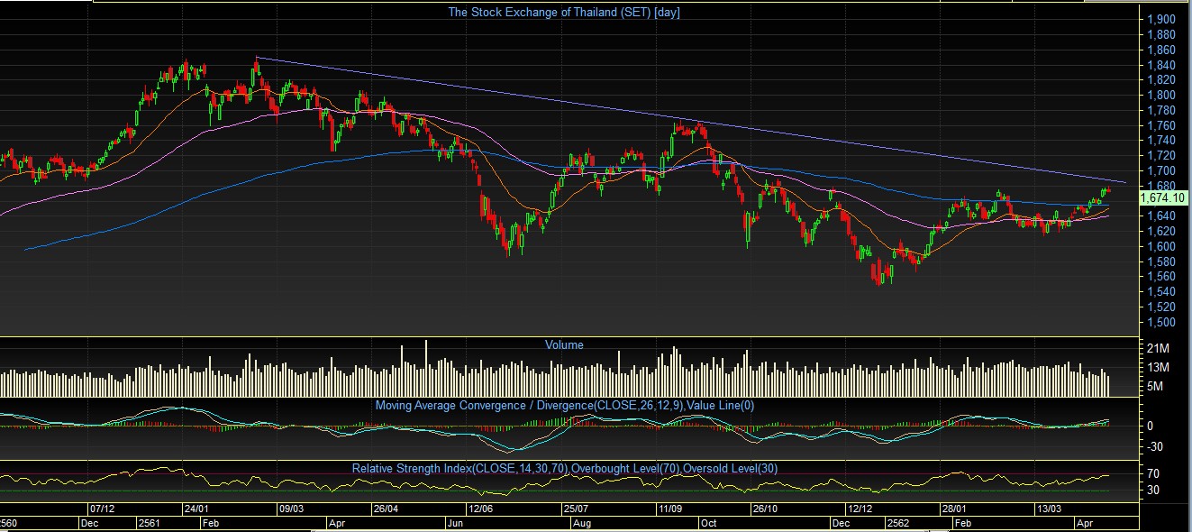 อ่อนตัวลงมาเล็กน้อย ถ้าหากดัชนีไม่สามารถผ่าน 1680 จุดขึ้นไปได้ อาจจะมีการย่อตัวลงมา และยืนยัน Triple Top ทำให้มีโอกาสที่จะเกิดการ