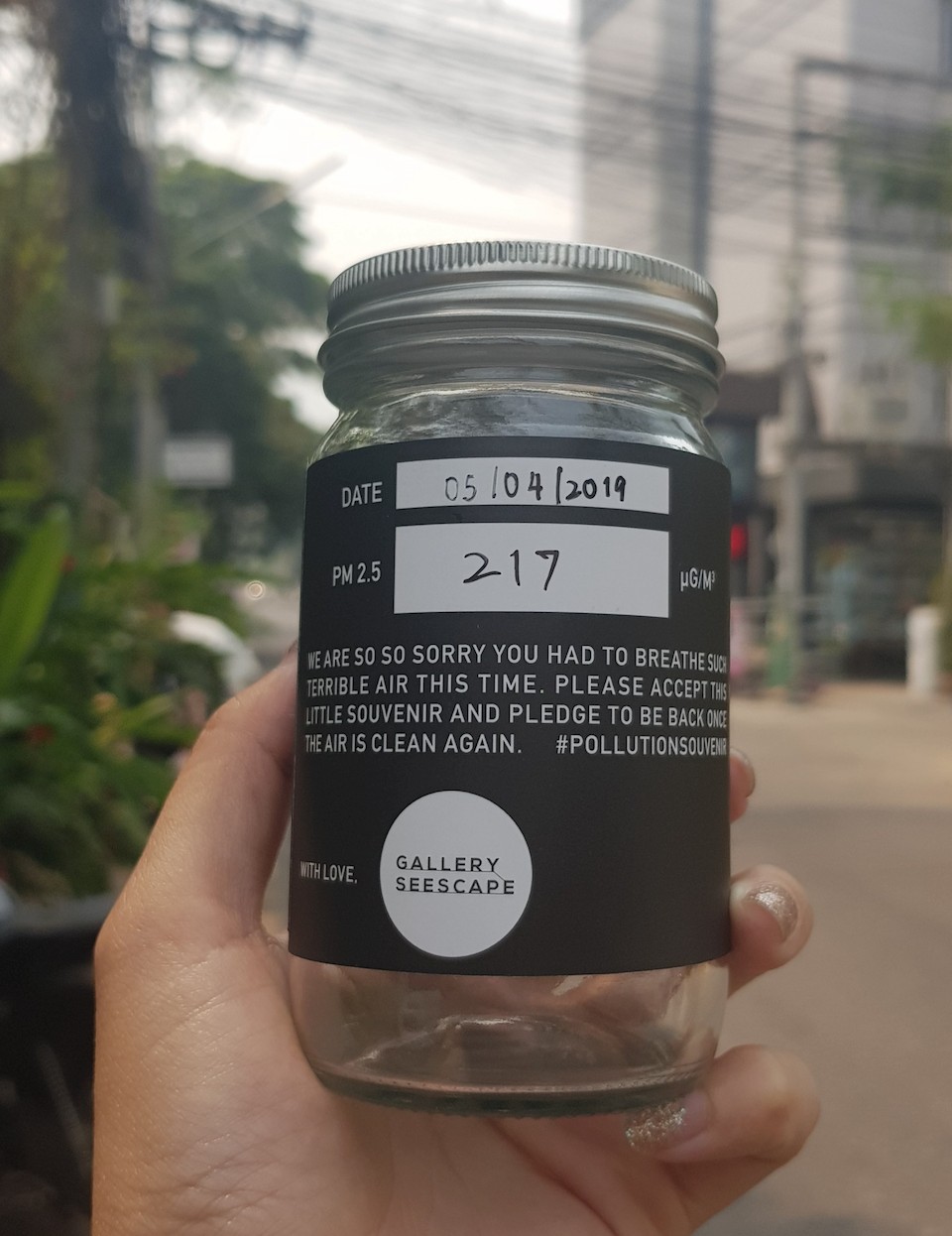 มีโฮสเทลที่เราพักแล้วก็อีกสองสามที่ ที่แบบจะแจกขวดอันนี้เพื่อแสดงค่า PM2.5 ในแต่ละวัน ที่มันสูงเกินกว่าค่ามาตรฐานมาพักใหญ่ๆละ