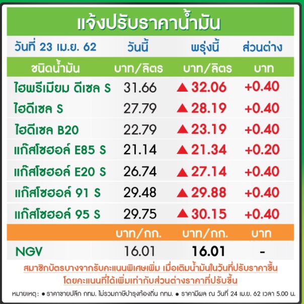 แจ้งปรับราคาน้ำมันทุกชนิด มีผลวันพรุ่งนี้ (24 เม.ย. 2562) ตั้งแต่เวลาตี 5 เป็นต้นไปครับ