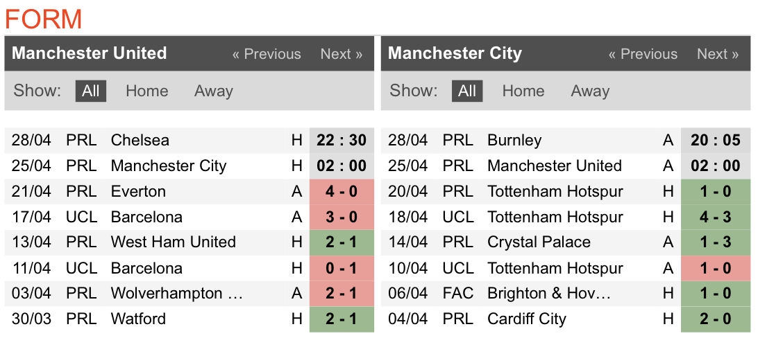 ฟอร์มแต่ละทีมล่าสุด