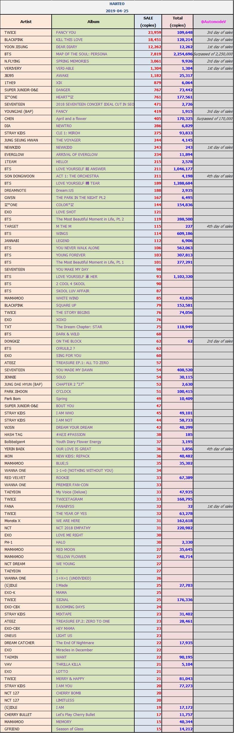 ยอดซื้ออัลบั้มจากชาร์ต HANTEO 25 เมษายน 2562