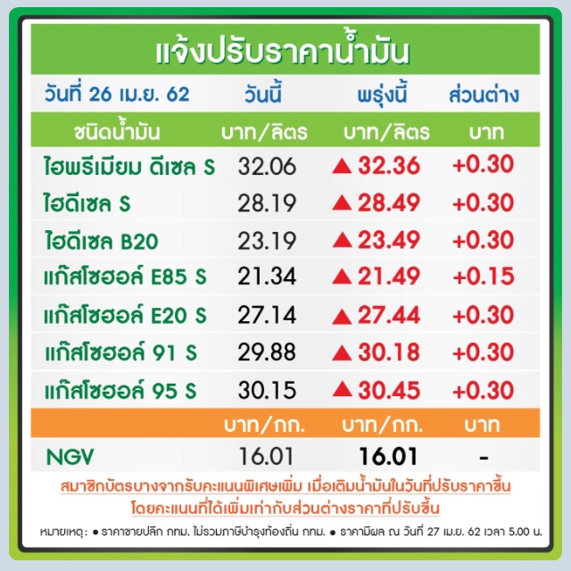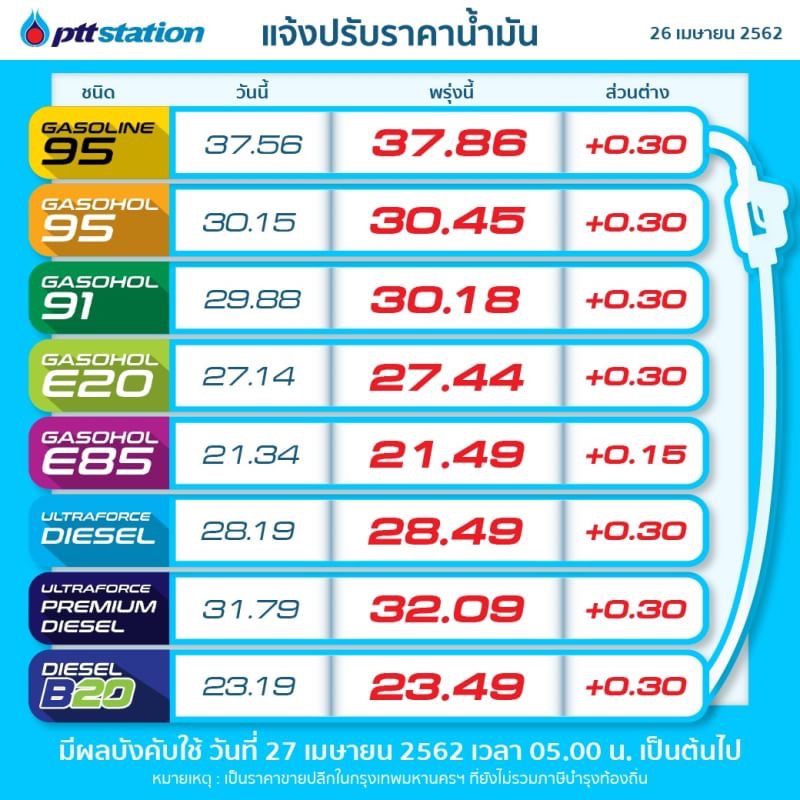 น้ำมันดีเซล ดีเซลพรีเมียม ดีเซล B20 รวมทั้งน้ำมันกลุ่มเบนซินและแก๊สโซฮอล์ทุกชนิด ปรับขึ้นราคา 30 สตางค์/ลิตร เว้น E85 ปรับขึ้น 15 สตางค์/ลิตร มีผลวันพรุ่งนี้ (27 เม.ย. 2562) ตั้งแต่เวลาตี 5 เป็นต้นไป รายละเอียดตามตารางข้างล่างค่ะ