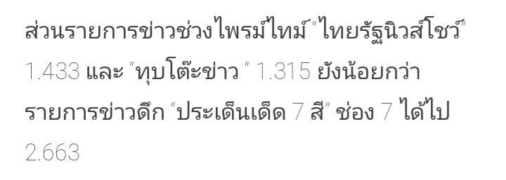 วันที่ 23 กุมภา CH3 - 1.443 CH7 - 1.357 ONE - 0.953 AMARIN TV - 0.729 THAIRATH TV - 0.709 WORKPOINT TV - 0.568 CH8 - 0.481 MONO 29 - 0.418 PPTV - 0.347 TRUE4U -