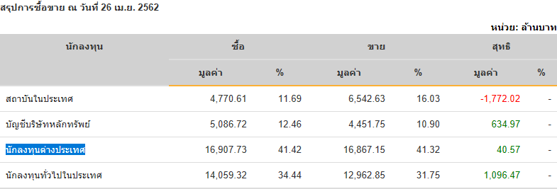 Sinthorn Summary 26/4/2562 : ต่างชาติซื้อสุทธิ 40.57 ลบ.
