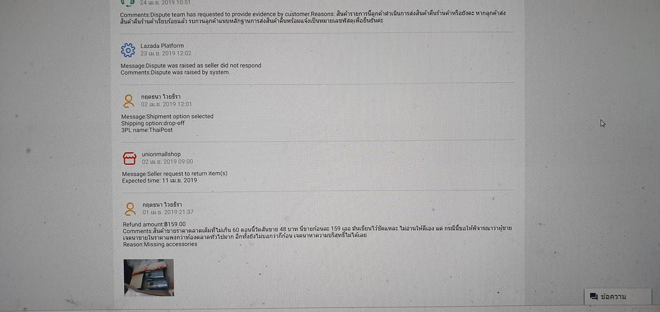 เออ สรุปง่าย ๆ ผมโง่เอง ไม่ดูให้ละเอียด ไม่อ่านรีวิว ทีนี่ผมก็ทำเรื่องขอคืน ผมแจ้งเจ้าหน้าที่ไปชัดเจนเลยว่าร้านค้าขายเกินราคา เรื่องคืนเงินผมไม่คิดด้วยซ้ำ ก็ได้ยินเรื่องของคนอื่นมาบ้าง แต่ก็ส่งคืนไป เพราะผมคงไม่เอามาใช้ให้เสียอารมณ์ ก็วานเด็กไปคืนครับ เด็กบอกว่าส่งคืนแล้ววันที่ 6 เมษายน 2562 ทีนี้ก็รอไปครับ ผู้ค้าก็ดูกวนประสาท ท่าทางจะปวดหัว ผมก็เลยเข้าไปดูสินค้าอื่น ๆ ในร้าน ก็ตามนี้ครับ นี่คร่าว ๆ นะครับ