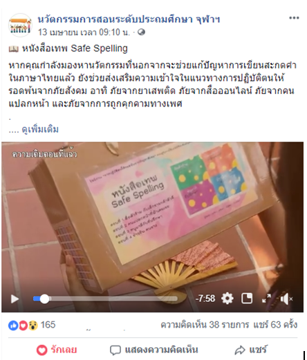 13 เมษายน 2562 เผยแพร่นวัตกรรมหนังสือเทพ safe spelling ผ่าน Facebook เพจนวัตกรรมการสอนระดับประถมศึกษา จุฬาฯ