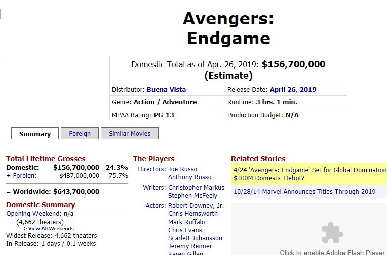 Avengers : Endgame รายได้เปิดตัวที่อเมริกาวันแรก 156.7 ล้านดอลลาร์ รวมทั่วโลก 643.7 ล้านดอลลาร์