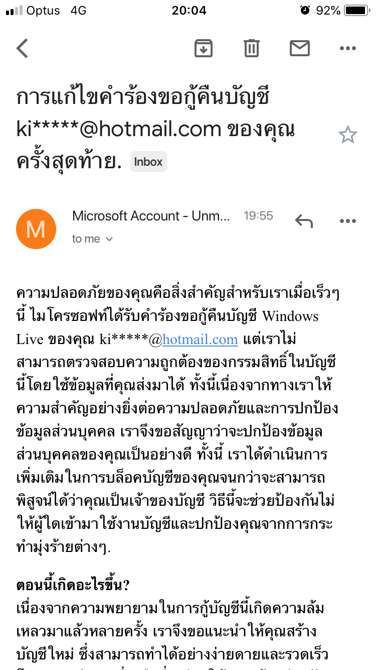 - เคย กรอก คำขอกู้คืนบัญชีไปทาง hotmail แต่ ทำยังไงก็ไม่ได้ T_T (พอดีมีข้อมูลเก่าที่ต้องใช้ ) - มีวิธีกู้ทางอื่นไหมครับ อย่างเช่นติดต่อ Microsoft ประเทศไทย โดยตรง ที่ไม่ต้องกรอก ข้อมูลผ่าน hotmail - ถ