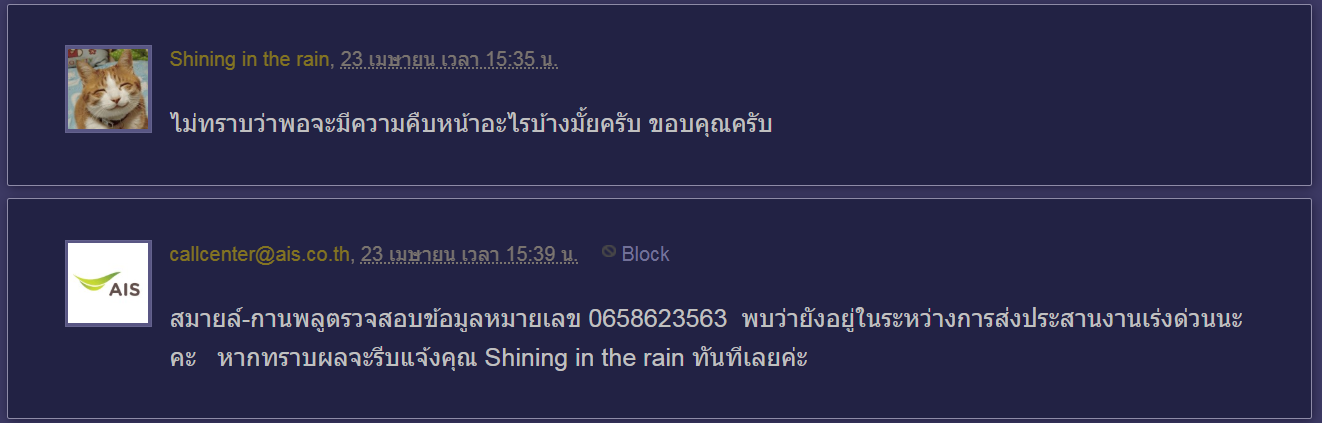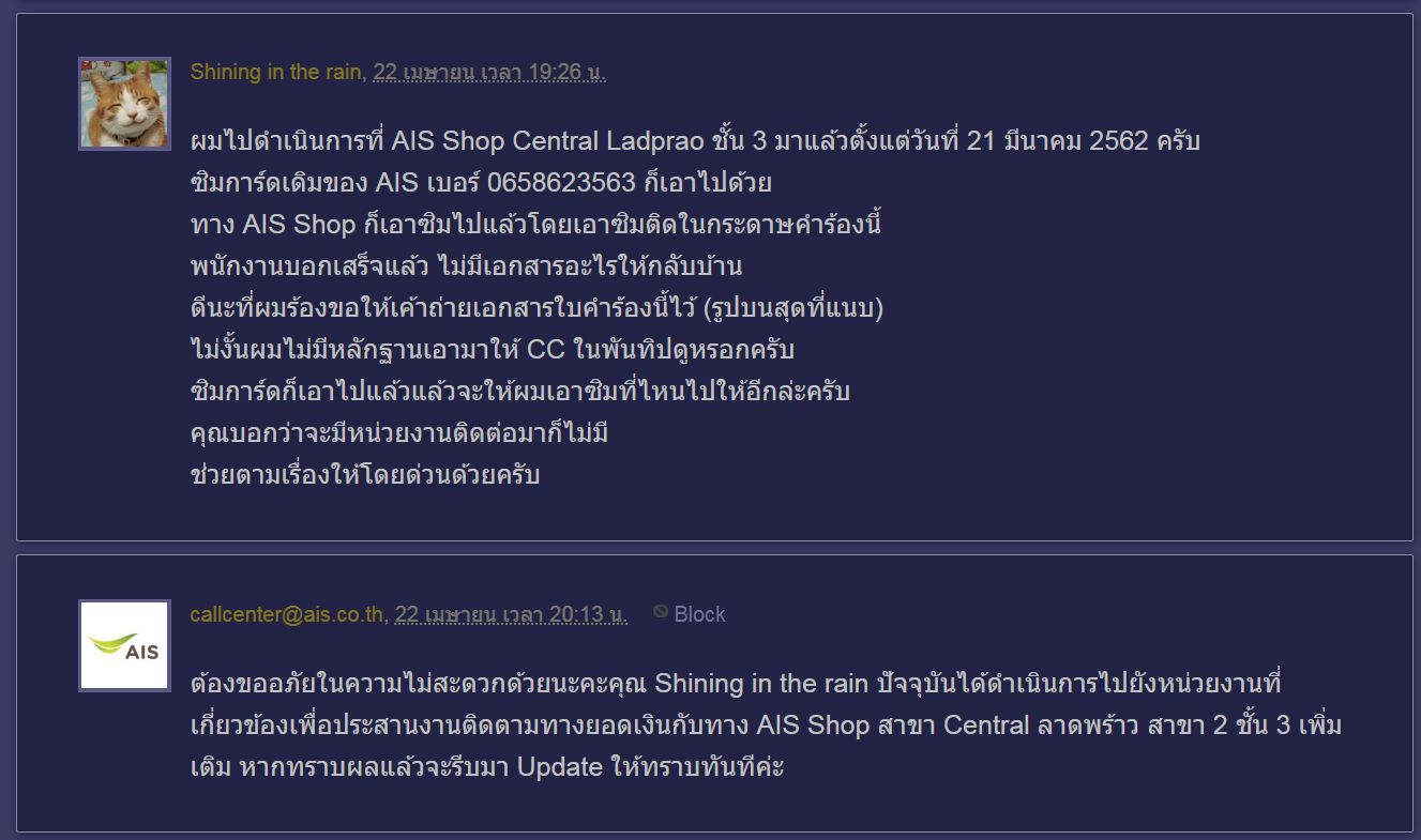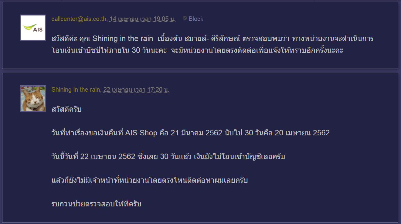 [โดนเตะถ่วง เรื่องขอเงินคืนจาก AIS] ทำเรื่องตั้งแต่ 21/3/62 ตอนนี้เรื่องเงียบฉี่ ทักไปก็ไม่ช่วยอะไร