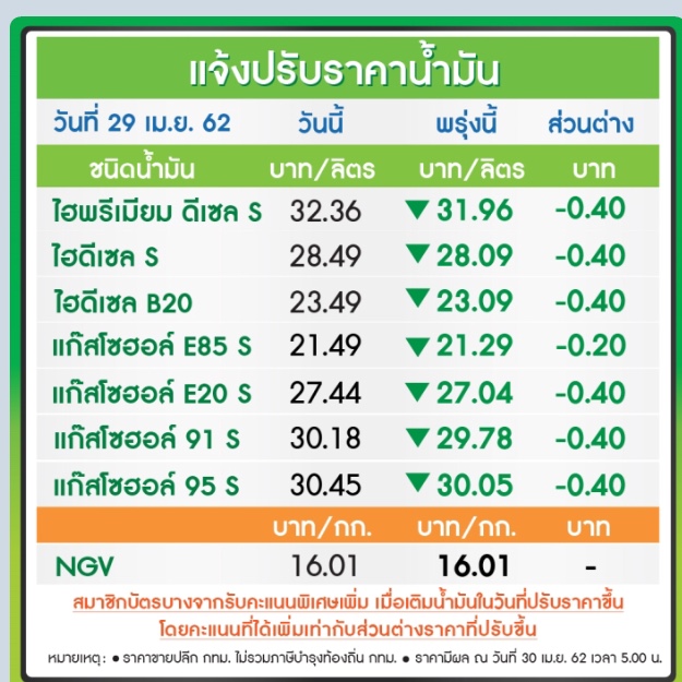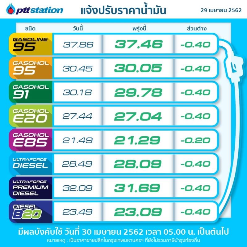 ข่าวดีคนใช้รถ 🚙 พรุ่งนี้น้ำมันทุกชนิดปรับลดราคาลง โดยน้ำมันดีเซล ดีเซลพรีเมียม ดีเซล B20 รวมทั้งน้ำมันกลุ่มเบนซินและแก๊สโซฮอล์ทุกชนิด ปรับลดราคาลง 40 สตางค์/ลิตร เว้น E85 ปรับลด 20 สตางค์/ลิตร มีผลวันพรุ่งนี้ (30 เม.ย. 2562) ตั้งแต่เวลาตี 5 เป็นต้นไป รายละเอียดตามตารางข้างล่างค่ะ