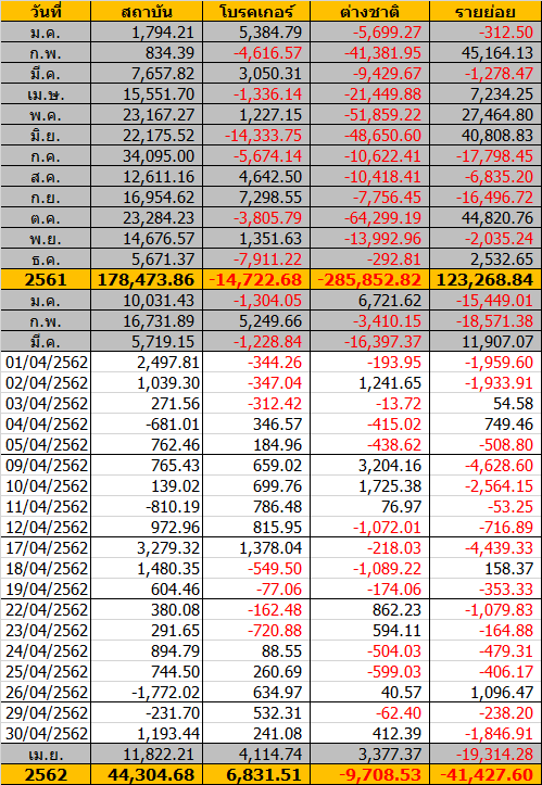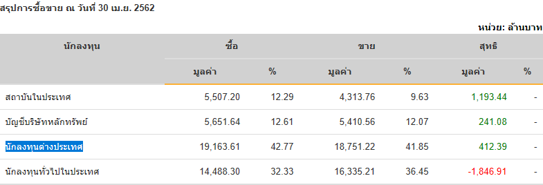 Sinthorn Summary 30/4/2562 : ต่างชาติซื้อสุทธิ 412.39 ลบ.
