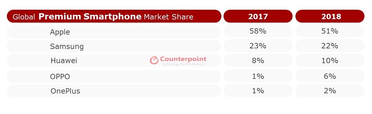 อย่างไรก็ตาม ส่วนแบ่งการตลาดในภาพรวมของปี 2018 ผู้นำยังคงเป็น Samsung (291.8 ล้านเครื่อง) ตามมาด้วย Apple (206.3 ล้านเครื่อง) และ Huawei (205.2 ล้านเครื่อง)