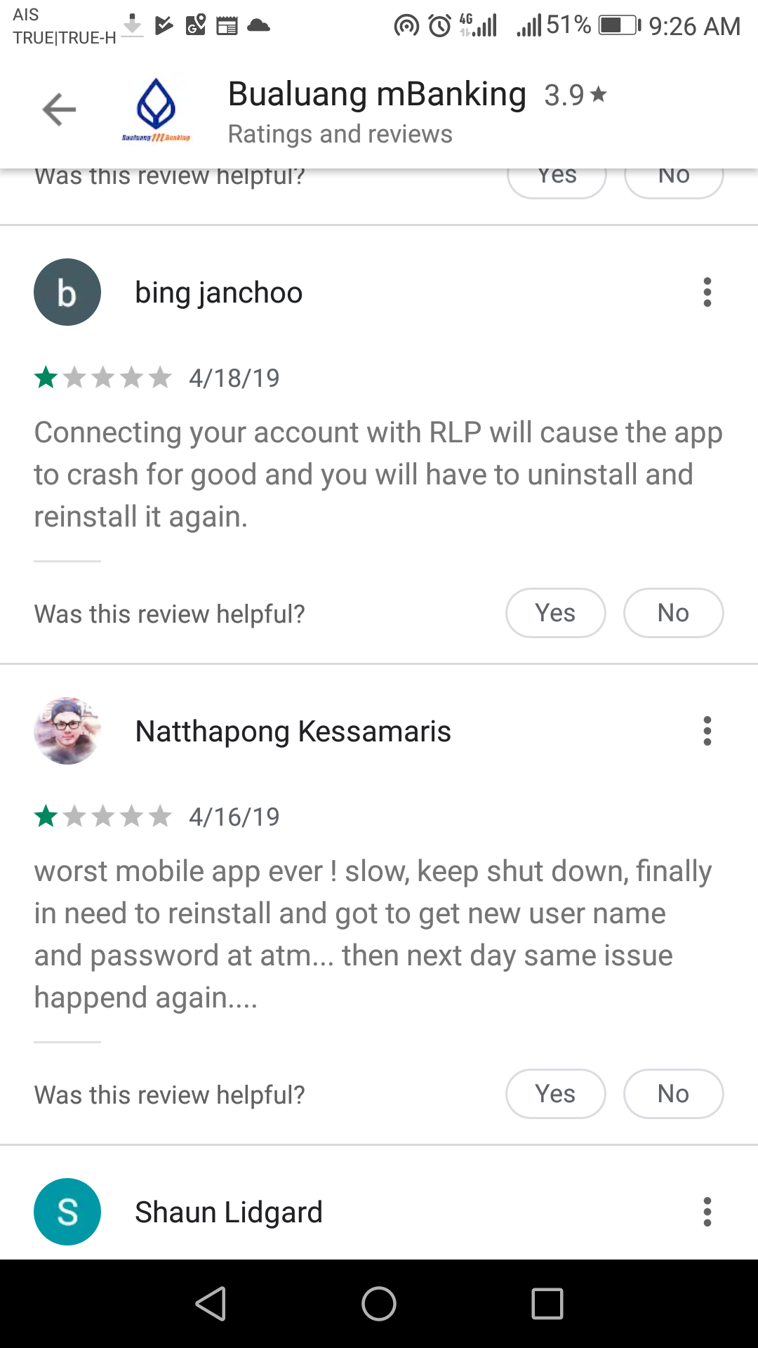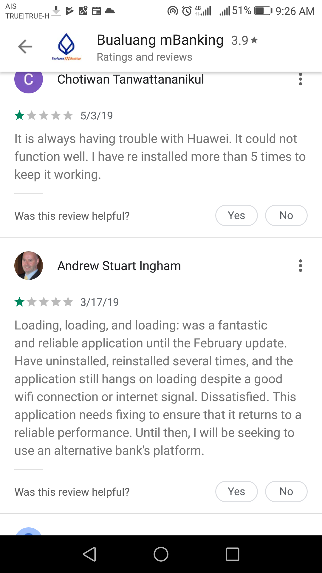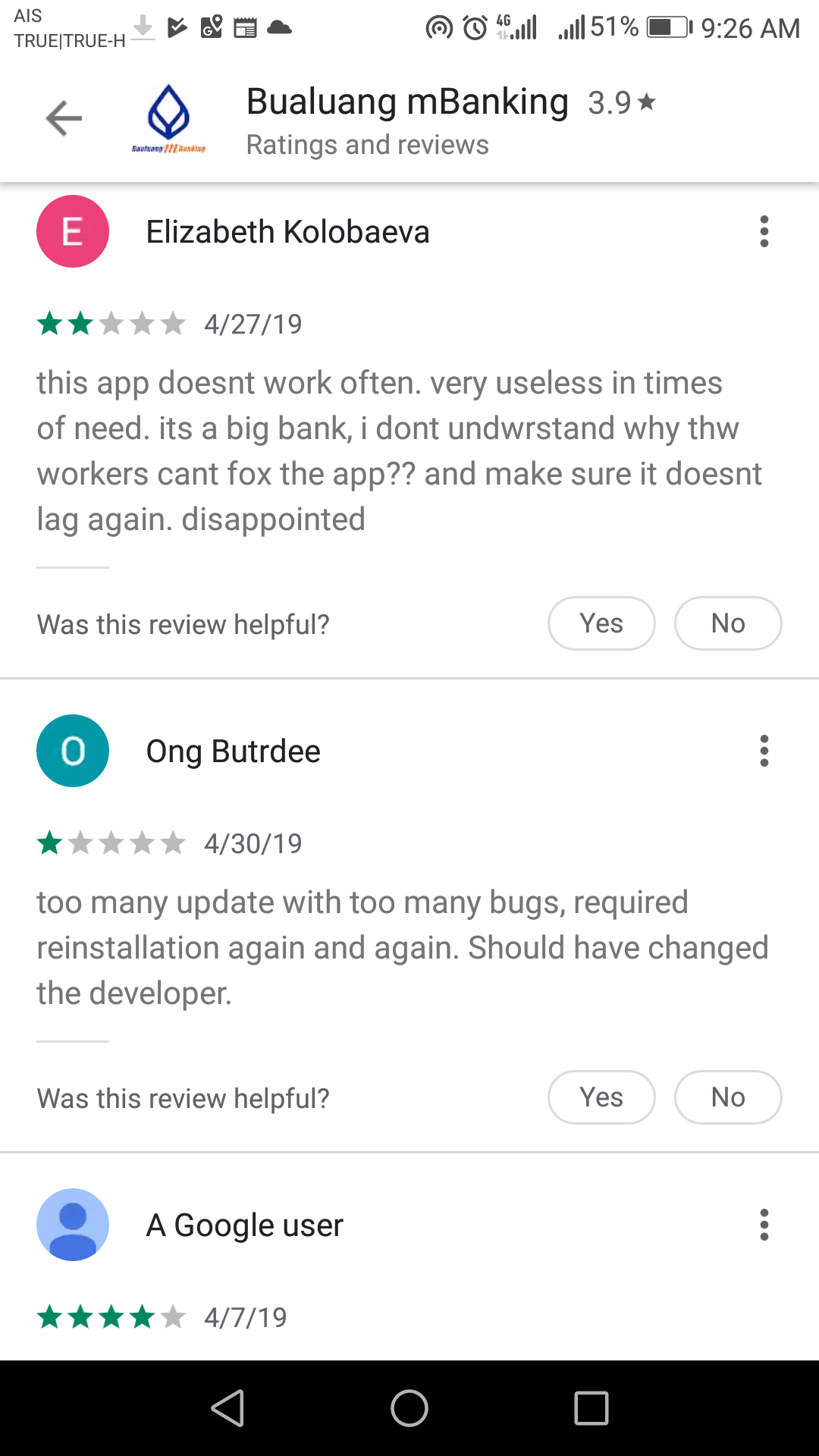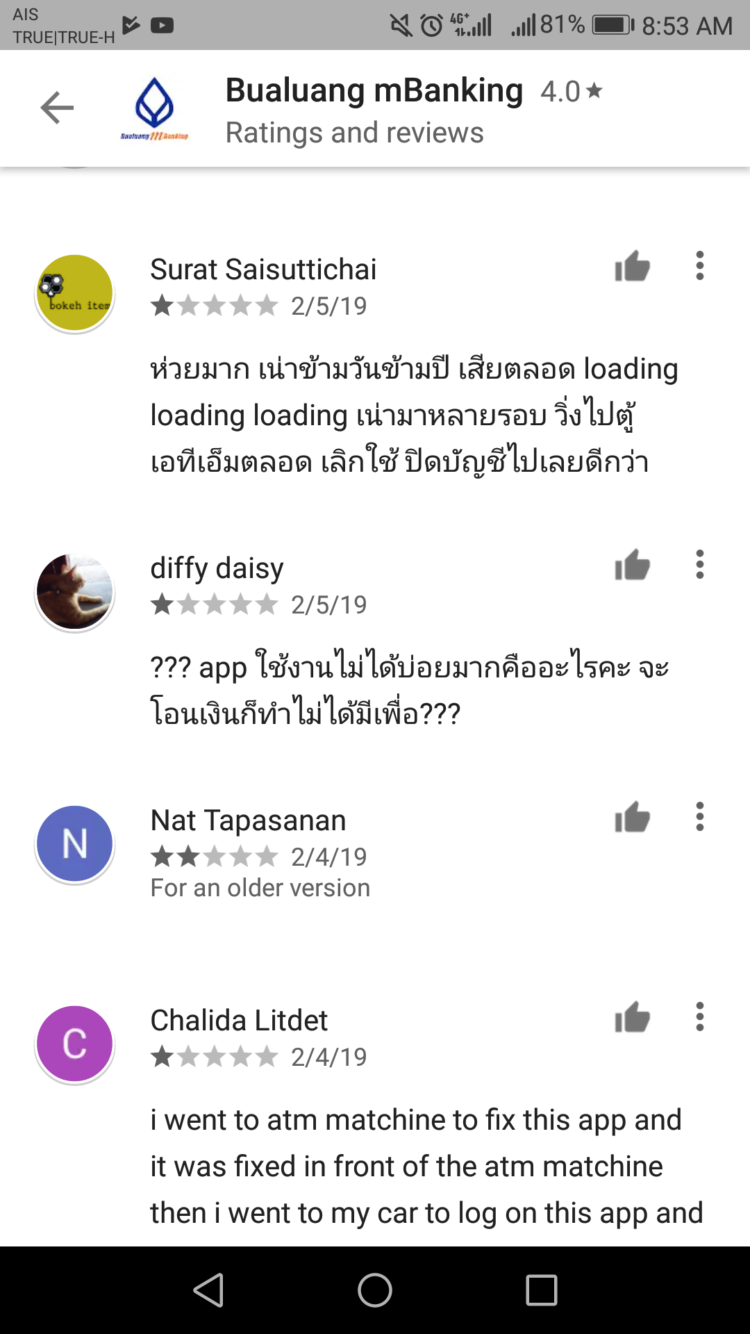 เหตุเกิดตั้งแต่เดือนธันวาคมปีที่แล้ว มีลุกค้าบางท่านไม่สามารถใช้ mobile app ของ ธนาคารได้ จนป่านนี้ เดือนพฤษภาคม ไม่ว่าลุกค้าต่อว่าไม่รุ้จะเท่าไร ทางไหนก็ยังไม่มีวี่แวว ว่าจะทำอะไรหรือแก้ไขใดๆ