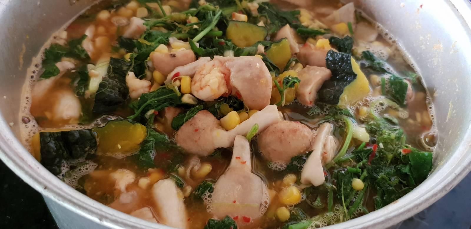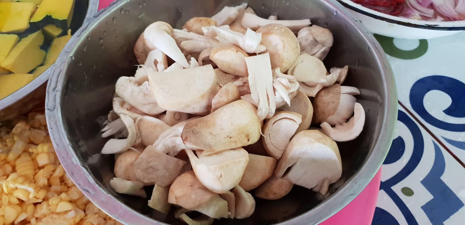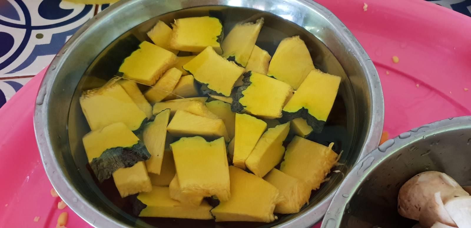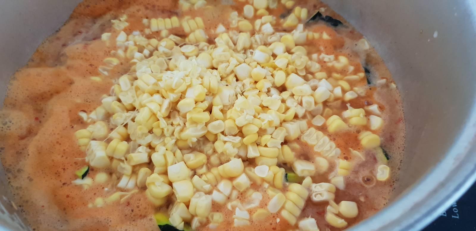 ฟักทองกับข้าวโพดใกล้สุกละปรุงเครื่องนิดหน่อยด้วย น้ำปลา ชูรส รสดี สามอย่างนี้ก็ตามชอบเลย😁 ใส่เห็ดฟาง เห็ดฟางไม่ค่อยสวยเลย😂 แต่ทั้งตลาดมีอยู่เจ้าเดียว ไม่มีสิทธิ์เลือกเลยเรา เอาน่ะก็กินได้อยู่น่า😁 ใส่กุ้งไปเลย