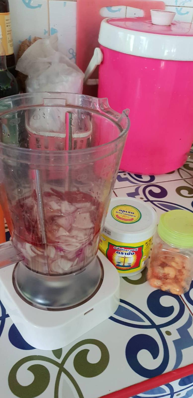 มาทำพริกแกงต่อ หอมแขก2หัวใหญ่ ล้างหั่นๆจะได้ปั่นได้ง่ายๆ กุ้งแห้งกำมือนึง พริกแห้ง10กว่าเม็ด กุ้งที่แกะไว้แช่ลืมในช่องฟรีส😆 เอามาละลาย