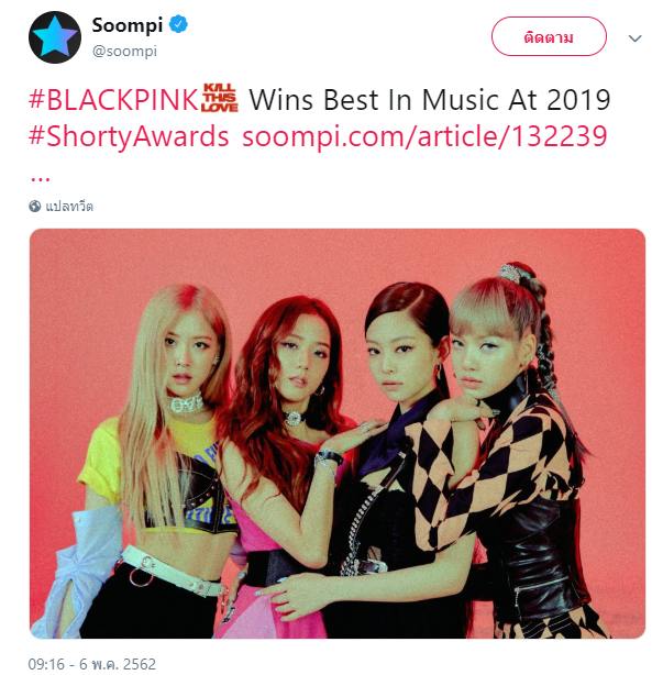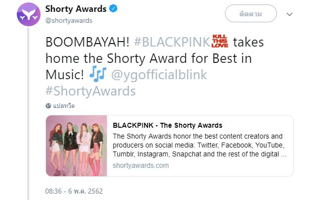👍 ขอแสดงความยินดีกับ BLACKPINK ที่ชนะได้รางวัล Best In Music ที่ 2019 @ShortyAwards! ถือเป็นรางวัลดนตรีทางฝั่งตะวันตกเป็นครั้งแรก! ขอบคุณ Shorty Award สำหรับรางวัลนี้