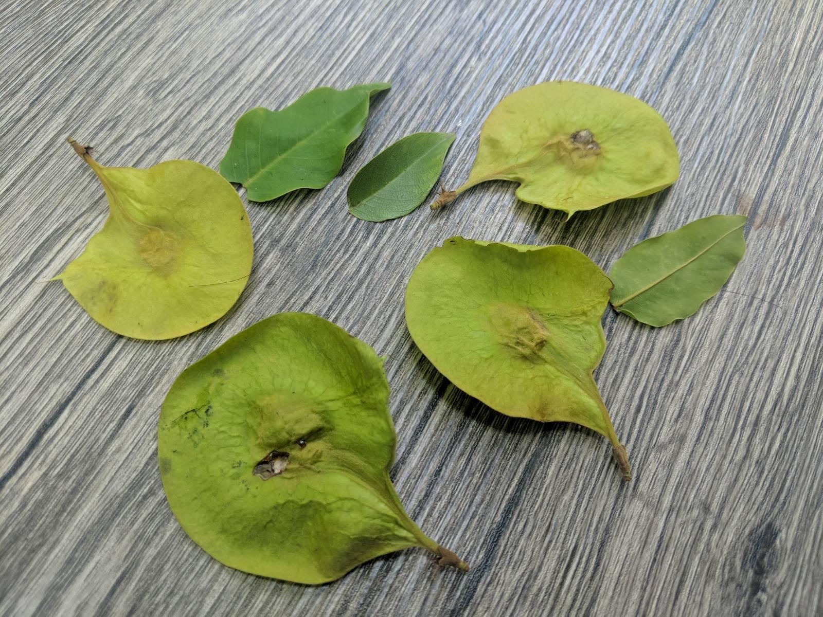 หลังจากใบใหม่เต็มต้น มันมีเหมือนผลร่วงออกมาเป็นใบสีเขียวกลมตรงกลางมีเมล็ด