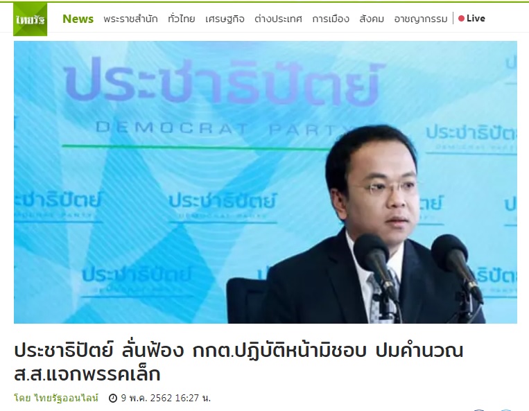 ประชาธิปัตย์ ลั่นฟ้อง กกต.ปฏิบัติหน้ามิชอบ ปมคำนวณให้พรรคเล็กได้ ส.ส.ปาร์ตี้ลิสต์ ชี้พรรคเล็กไม่ได้มีคะแนนถึงเกณฑ์ ส.ส.พึงมี แขวะคะแนนไม่ได้หายแต่ตกทะเลไปเป็นล้านคะแนน...