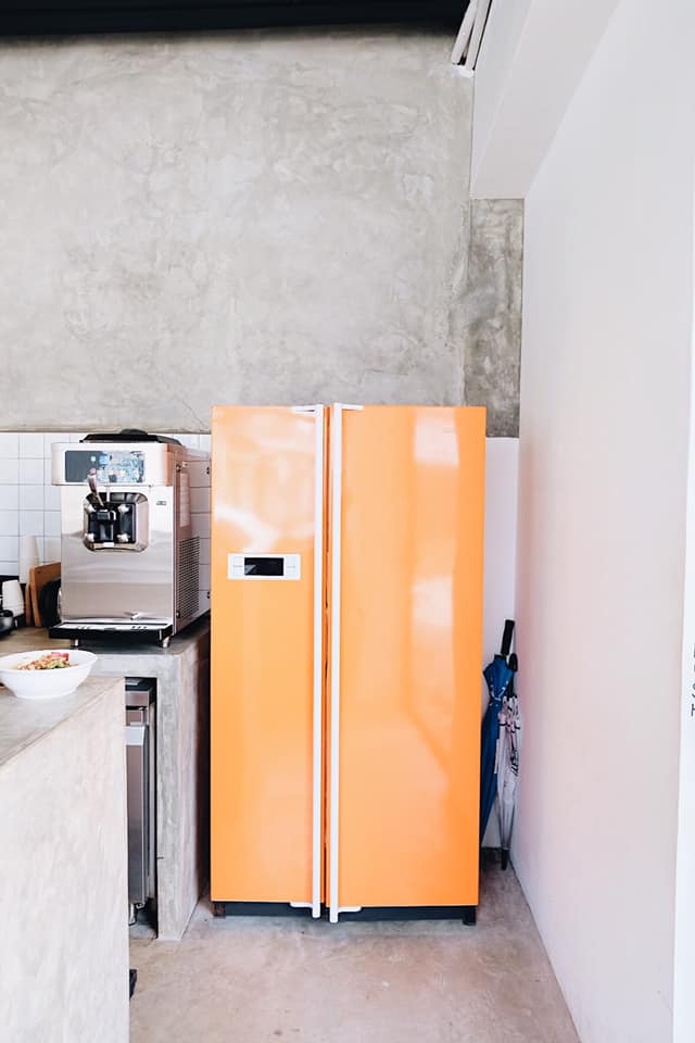 คาเฟ่ในปีนัง มี softserve ที่มันเปลี่ยนรสเรื่อยๆ วันที่ไปเป็นชาเขียว เปิดตู้เย็นสีส้มเข้าไปจะเป็นที่นั่ง