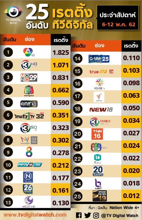 เรตติ้งประจำสัปดาห์ 6-12 พ.ค.2562