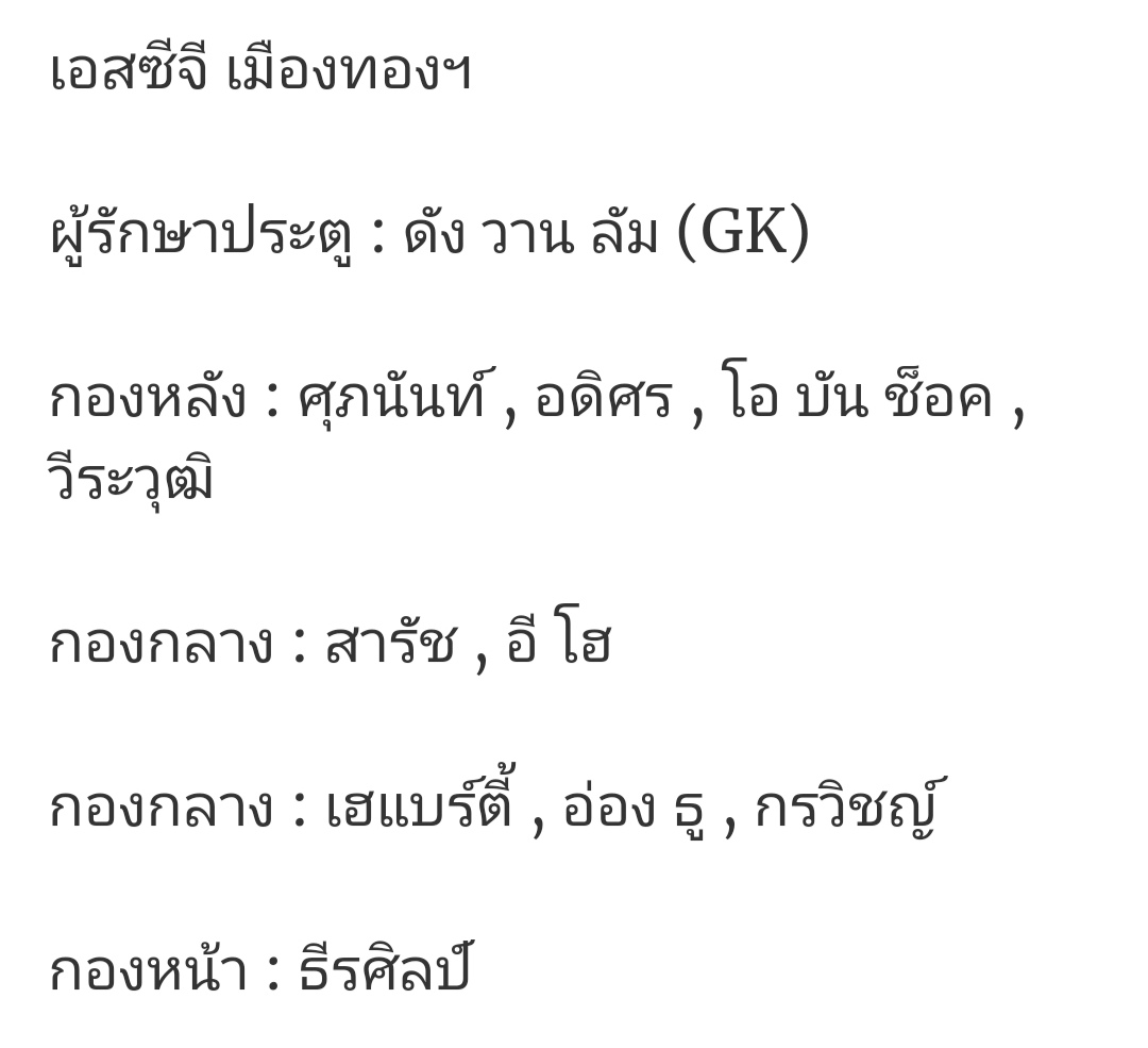 เมืองทองที่ลงทุน 400 ล้าน แต่ Squad ทีมเล็กไปหน่อยหรือเปล่า ลงแต่ละเกม ก็มีตัวอยู่แค่เท่านี้ ไม่ค่อยจะเปลี่ยนแปลง โอบันซ็อค เกมที่แล้วลงแค่ 20 นาทีก็ได้รับบาดเจ็บต้องถูกเปลี่ยนตัวออก เกมนี้ก็ต้องลงเป็นตัวจริงอีก อีโฮ ที่ผิดพลาดจากเพลงที่แล้วหลายจังหวะ ก็ยังได้รับโอกาสเป็นตัวจริงอีก ดังวานลัม ที่แทบจะไม่มีเซฟมหัศจรรย์ ก็ยังได้รับโอกาสลงต่อไป อ่องธู ตั้งแต่มายังยิงไม่ได้เลยมั้ง และนักเตะไทยอื่นๆอีก