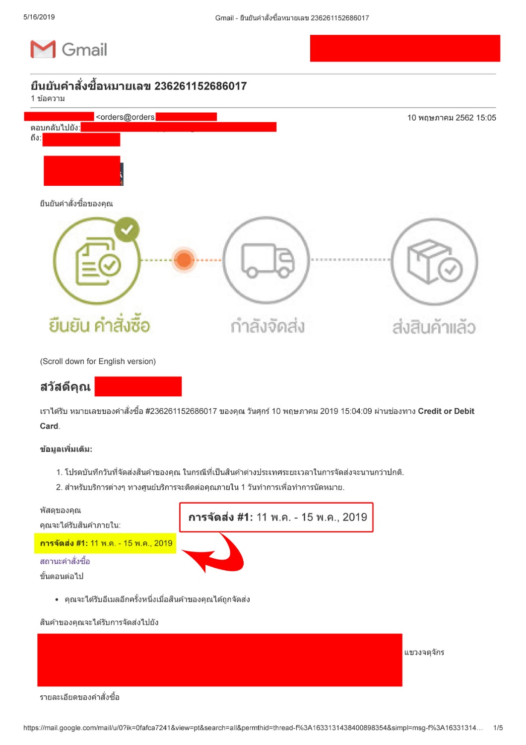 หลังสั่งมี Email แจ้งมา คอนเฟริม รายละเอียด และยังระบุวันที่จะได้รับสินค้า ระหว่า 11-15 พ.ค. 2019 ตามรูป