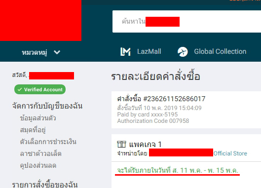 โดยสั่งในวันที่ 10 พ.ค. 2019 เวลา 15.05 ก่อนกดสั่ง มีการระบุระยะเวลาจัดส่ง ระหว่าง วันเสาร์ที่ 11 พ.ค. - พุธที่ 15 พ.ค. 2019