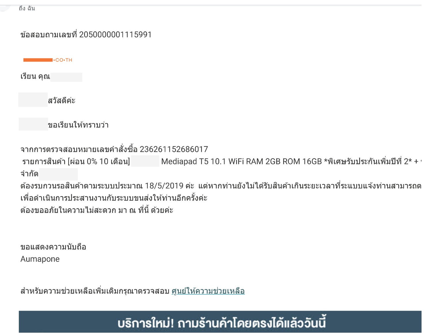แม้แต่ การโทรไปเช็คทางระบบอัตโนมัติของคอลเซ็นเตอร์ เอง ก็ยังแจ้งว่า จะได้รับระหว่าง 11 พ.ค. 2019 - 15 พ.ค. 2019