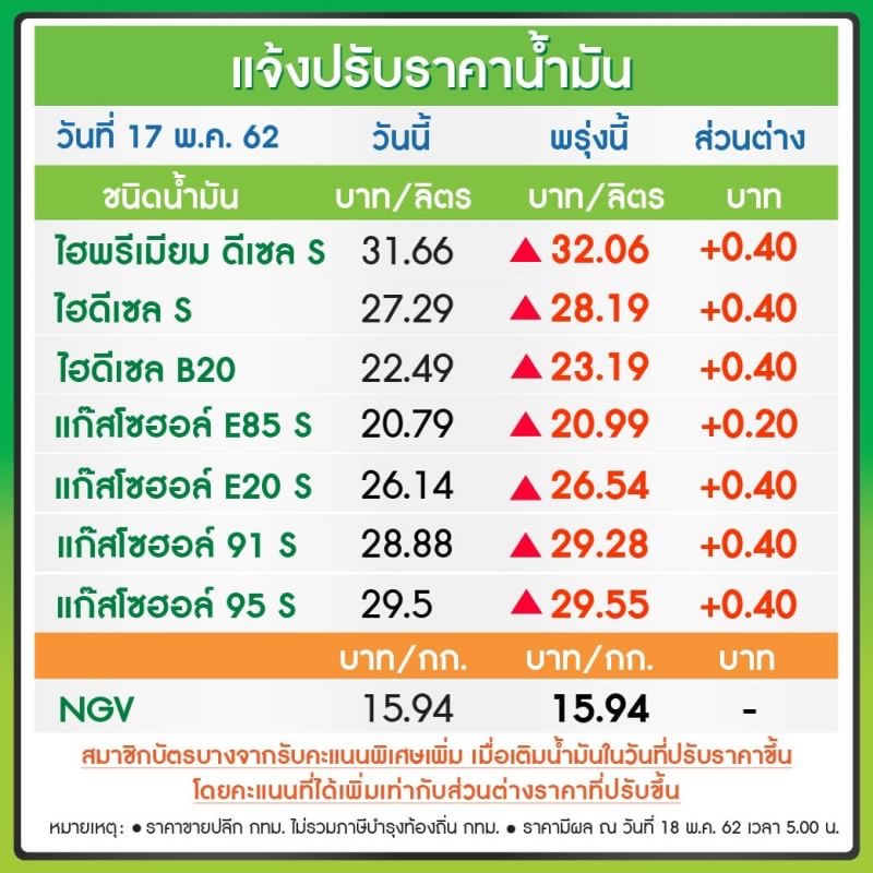น้ำมันดีเซล ดีเซลพรีเมียม ดีเซล B20 รวมทั้งน้ำมันกลุ่มเบนซินและแก๊สโซฮอล์ทุกชนิด ปรับขึ้นราคา 40 สตางค์/ลิตร เว้น E85 ปรับขึ้น 20 สตางค์/ลิตร มีผลวันพรุ่งนี้ (18 พ.ค. 2562) ตั้งแต่เวลาตี 5 เป็นต้นไป