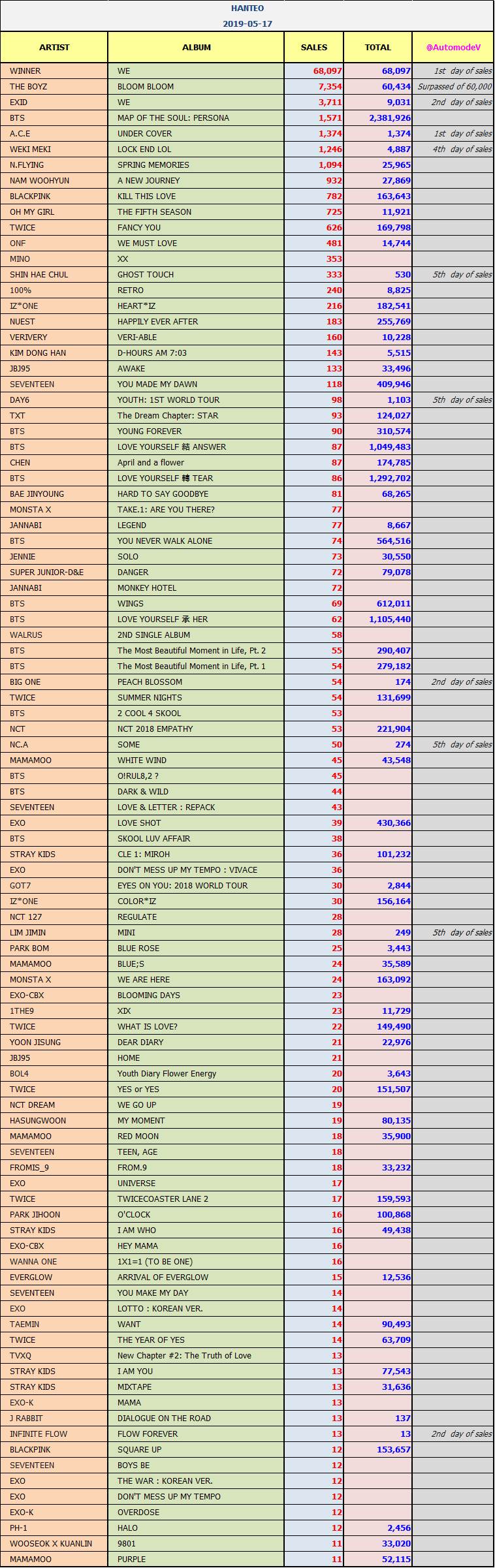 ยอดซื้ออัลบั้มจากชาร์ต HANTEO 17 พฤษภาคม 2562