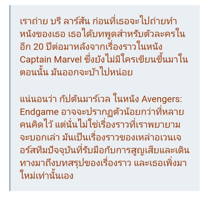 ด้านกัปตันมาร์เวลที่โปรโมทมานักหนาว่า เก่งที่สุด รอมาตื่นเต้นยิ่งกว่าจะเจอไนท์คิง ว่าจะมีบทบาทอะไรบ้างใน Endgame ผกก.อ้างแค่ว่า ไม่ได้เน้นตัวนี้ เธอมาทีหลัง แต่ต้องการจะเน้นที่ตัวละครอื่นที่กำลังโศกเศร้า